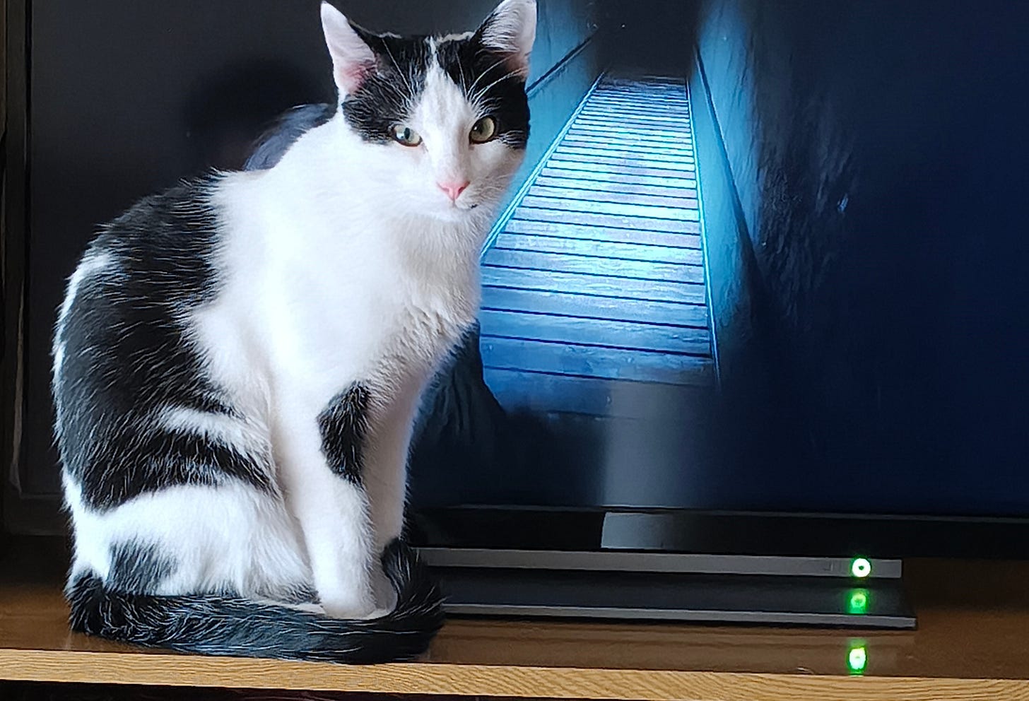 Últimamente ha desarrollado una costumbre curiosa. Cuando enciendo la consola en el salón, Guppy aparece casi de inmediato y se coloca delante de la televisión. No cerca, ni al lado. Justo delante, en el punto exacto en el que la pantalla deja de verse. Se sienta ahí con toda naturalidad, como si su presencia formara parte del funcionamiento de la tele. Incluso si está dormido a veces aparece ahí, a veces se ha dormido delante de la tele. No tengo claro si lo hace porque quiere jugar, porque quiere atención o simplemente porque cree que lo que ocurre en la pantalla también es algo que le pertenece. A veces, cuando lo hace, tengo la sensación de que mira desafiante.